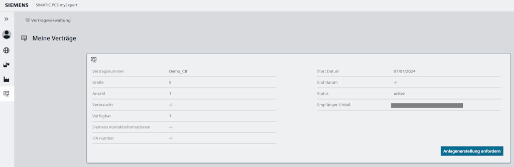 Der dargestellte Bereich zeigt den Contract view von einem Nutzer mit einem zugewiesenen Vertrag der Größe "S". Die Ansicht enthält Informationen zu Vertragsnummer, Größe, verfügbaren sowie verbrauchten Anlagen, Start und End Datum und den Status des Vertrags. Über die Schaltfläche "Anlagenerstellung anfordern" kann mit vorhandener SID eine Anlage zu diesem Vertrag erstellt werden.