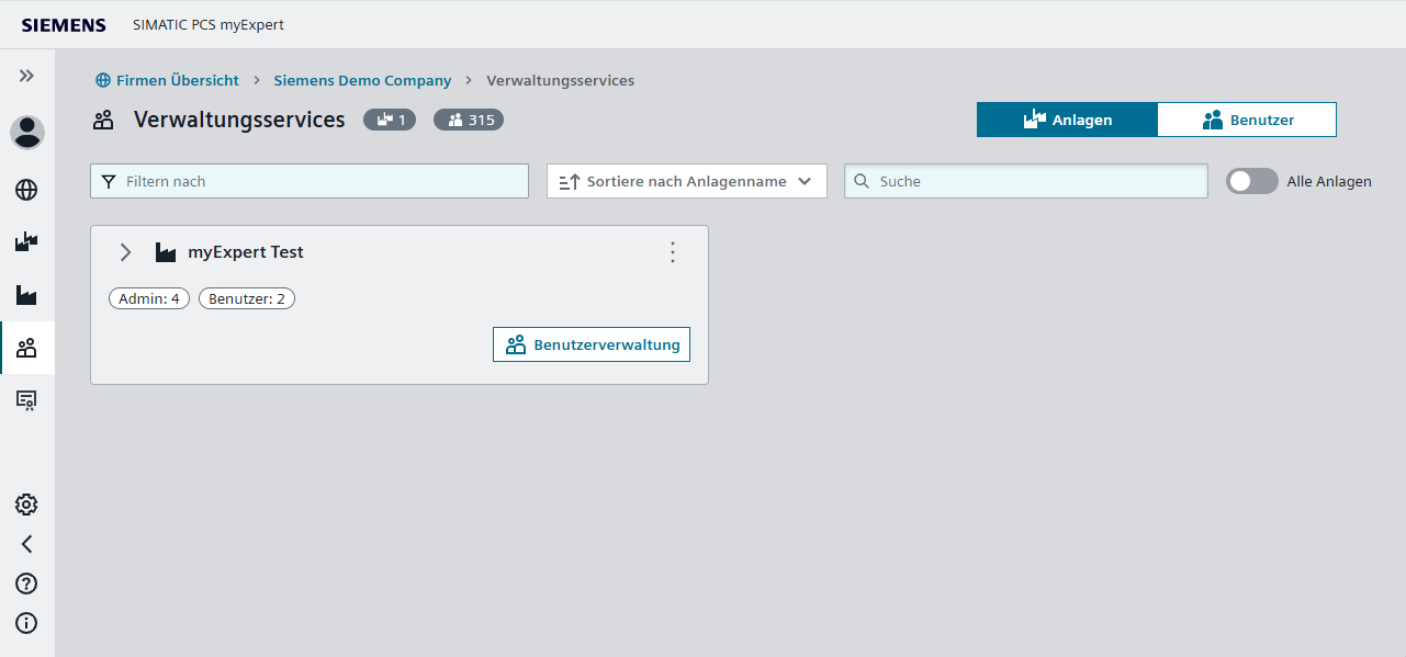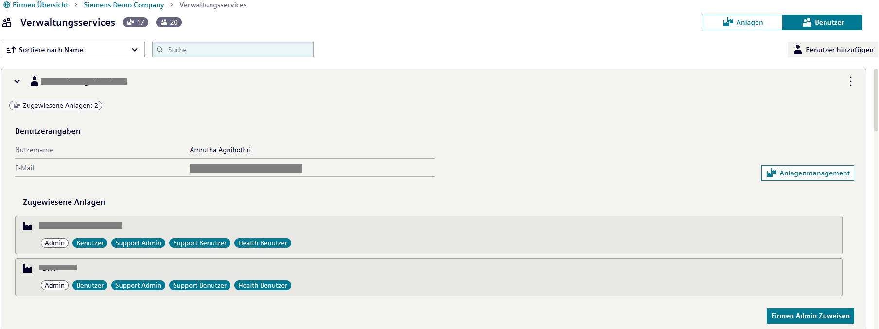 Zeigt eine Übersicht aller Anlagen der Firma. Jeder Eintrag gibt Mengeninformationen über zugeordnete Rollen an und bietet Zugang zur Benutzerverwaltung der Anlage. Über die Benutzerverwaltung können alle zugehörigen Benutzer angezeigt und deren Rollen verwaltet werden.