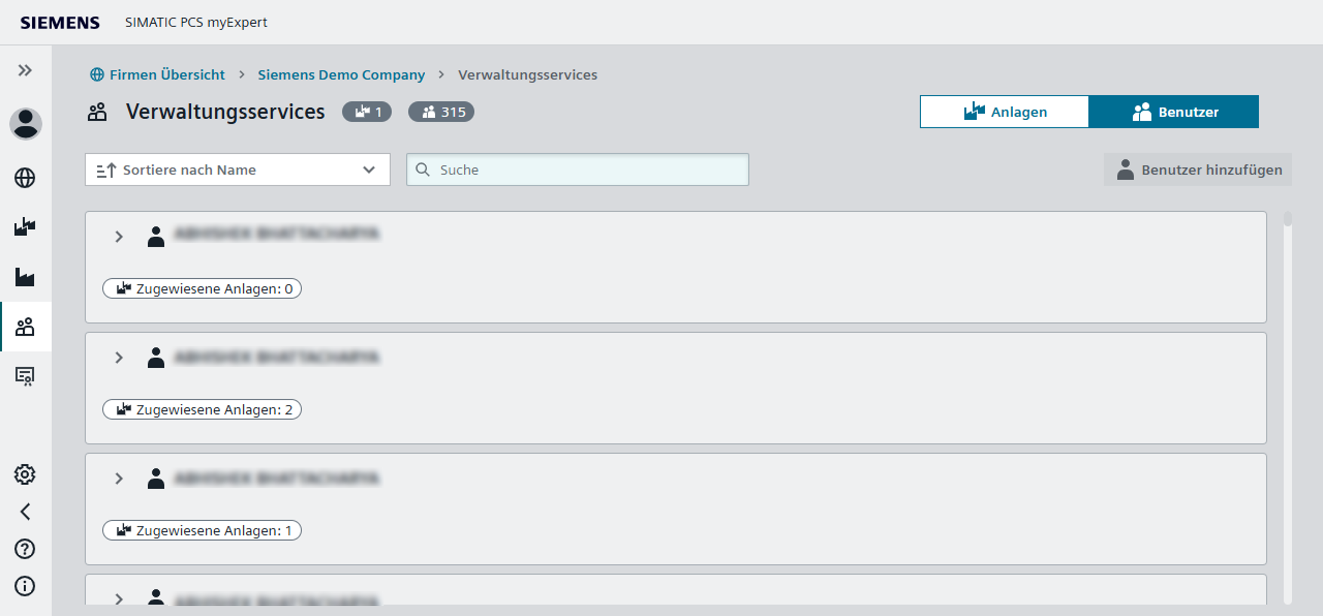 Zeigt eine Übersicht aller Benutzer der Firma. Jeder Eintrag gibt Mengeninformationen über zugeordnete Anlagen an und bietet Zugang zu dessen Anlagenverwaltung. Über die Anlagenverwaltung können alle zugehörigen Anlagen angezeigt und die Rollen verwaltet werden.