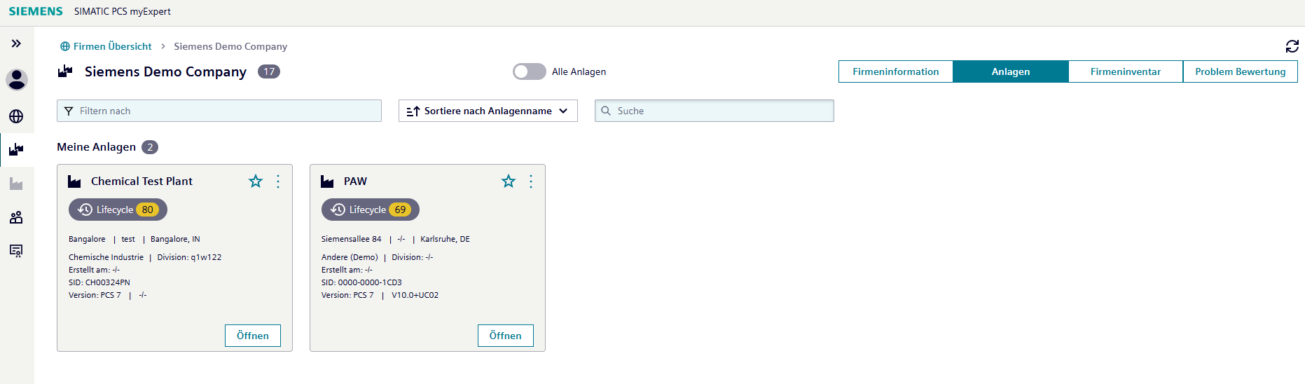 myCompany ist ein Bereich von myExpert, welcher eine Übersicht über alle Anlagen der betreffenden Firma bietet. Dabei werden nur solche Anlagen angezeigt, auf die der aktuelle Benutzer aufgrund seiner Berechtigungen Zugriff hat.