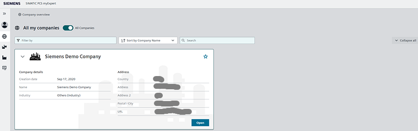 The Company overview is an area of myExpert that serves to select a company. Only companies to which the current myExpert user's user group belongs are displayed on the Company overview.